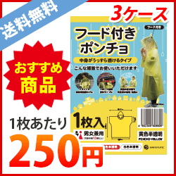 品番 PONCHO-YELLOW-3 販売価格(1箱) 25000円x3箱(税込)22727.3円(税抜) 肩幅×丈(mm) 約1260x約1000mm 1枚あたりの価格 【税込】250円【税抜】227.3円 1冊あたりの枚数 1枚入り 1箱あたりの冊数(合計枚数) 100冊入り(枚/箱) 材質 PEVA 突然の雨対策や災害時の防寒・保温に スポーツ観戦、野外ライブにも、マラソンや自転車通勤にも最適 男女兼用(対象年齢13歳以上)フード付ポンチョ 黄色半透明 まとめて3ケース(箱)