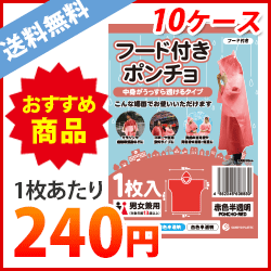 品番 PONCHO-RED-10 販売価格(1箱) 24000円x10箱(税込)21818.2円(税抜) 肩幅×丈(mm) 約1260x約1000mm 1枚あたりの価格 【税込】240円【税抜】218.2円 1冊あたりの枚数 1枚入り 1箱あたりの冊数(合計枚数) 100冊入り(枚/箱) 材質 PEVA 突然の雨対策や災害時の防寒・保温に スポーツ観戦、野外ライブにも、マラソンや自転車通勤にも最適 男女兼用(対象年齢13歳以上)フード付ポンチョ 赤色半透明 まとめて10ケース(箱)
