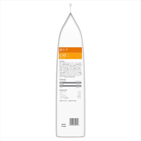 〈製品の特徴〉●尿pHに配慮しミネラルのバランスを調整●マグネシウム、カルシウム、リンの含有量を調整し、クエン酸カリウム、オメガ-3脂肪酸を配合●低ナトリウム●抗酸化成分配合■原産国:チェコ■原材料:米、トリ肉(チキン、ターキー)、コーングルテン、動物性油脂、フィッシュ、植物性油脂、チキンエキス、魚油、亜麻仁、ミネラル類(カルシウム、ナトリウム、カリウム、クロライド、銅、鉄、マンガン、亜鉛、ヨウ素)、 乳酸、ビタミン類(A、B1、B2、B6、B12、D3、E、ベータカロテン、ナイアシン、パントテン酸、葉酸、ビオチン、コリン)、アミノ酸類(タウリン、トリプトファン、メチオニン)、酸化防止剤(ミックストコフェロール、ローズマリー抽出物、緑茶抽出物)■成分:たんぱく質29.5%以上、脂質13.0%以上、粗繊維2.0%以下、灰分7.0%以下、水分9.0%以下、オメガ-3脂肪酸1.11%、代謝エネルギー388kcal/100g■内容量:4kg■給与量(1日あたり) 体重(kg)234567カップ0.30.50.60.70.80.9g364961728393■メーカー:日本ヒルズコルゲート■JANコード:052742311708 どちらかというと、尿石症の症状消失後の再発防止や維持食としての使用が多いと思います。