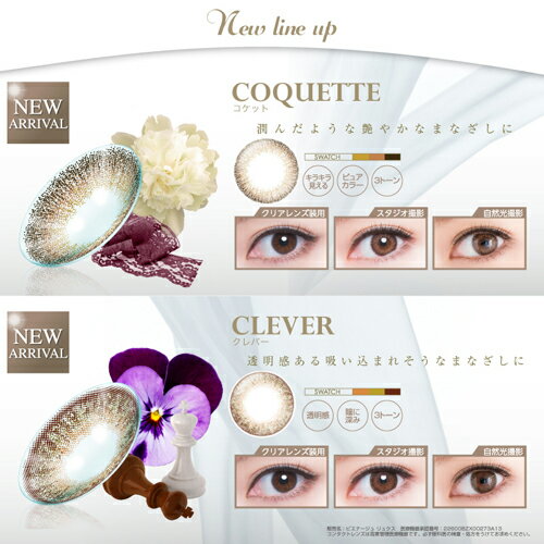 01 コケット:潤んだような艶やかなまなざしに! 02 クレバー:今よりもっと可愛くなりたい女の子のためのナチュラル系カラコン! 【カラー見本についてのお断り】 このページの商品のカラー見本については実際のカラーとは若干異なる場合があります。