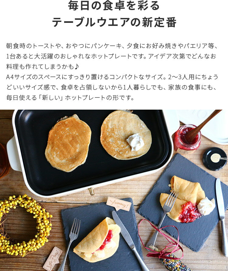 <付属内容> ・ホットプレート本体 ・平面プレート(お好み焼きなど) ・たこ焼きプレート 商品サイズ 本体(付属品なし):幅375×奥行き235×高さ140(mm) 平面プレート:幅300×奥行き204×高さ35(mm) たこ焼きプレート:幅300×奥行き204×高さ35(mm) 重量 2.1kg(平プレート使用時) 2.2kg(たこ焼きプレート使用時) 材質 本体:スチール/フェノール樹脂、プレート:アルミダイキャスト 電源 AC100V(50/60Hz) 消費電力 1200W(50/60Hz) その他付属品 保証書付き取扱説明書、電源コード、木べら 機能 サーモスタッド、温度ヒューズ(240度)、マグネットプラグ、無断階温度調節(保温〜250度) 変更について 2018年5月10日:ネイビー追加 2018年8月29日:レリーフ追加 2018年10月23日:ペールピンク追加 2018年11月15日:モスグリーン/グレージュ追加 2019年5月27日:グレージュ削除/ペールブルー追加 2019年9月25日:スモーキーグリーン/サンドベージュ/パープル追加 2020年5月1日:7カラー削除、グレージュ/グリーン/チャコールグレー/アッシュブルー追加 2020年5月1日:4カラー削除 注意事項 お買い物の際は、会社概要の「その他の注意点」を必ずご確認ください。